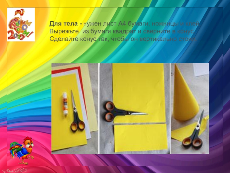 Слайд 3Для тела - нужен лист А4 бумаги, ножницы и клей. Вырежьте из