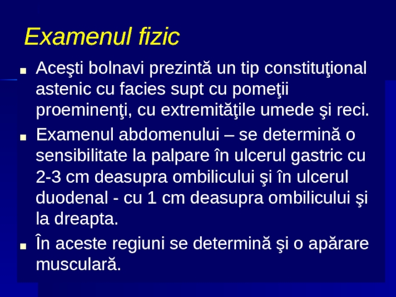 Examenul abdomenului – se determină o sensibilitate la palpare în ulcerul gastric cu 2-3 cm deasupra ombilicului şi în ulcerul duodenal - cu 1 cm deasupra ombilicului şi la dreapta.