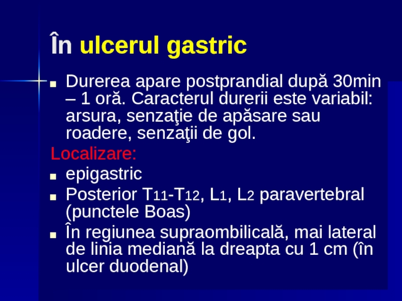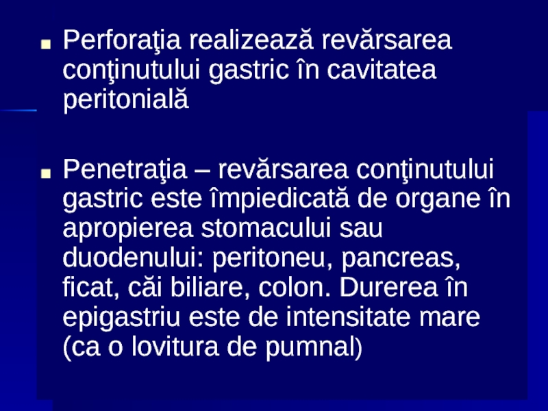 conţinutului gastric este împiedicată de organe în apropierea stomacului sau duodenului: peritoneu, pancreas, ficat, căi biliare, colon. Durerea în epigastriu este de intensitate mare (ca o lovitura de pumnal)