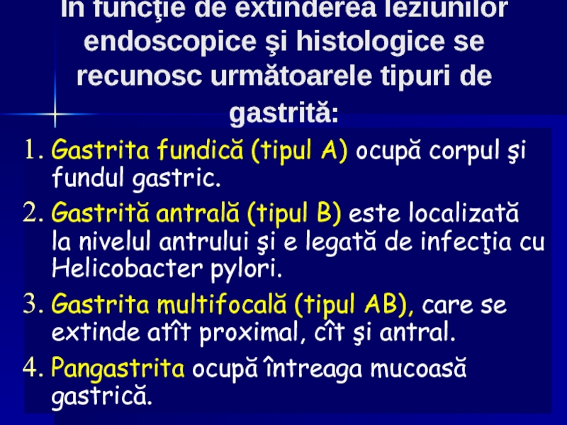 Слайд 13În funcţie de extinderea leziunilor endoscopice şi histologice se recunosc următoarele