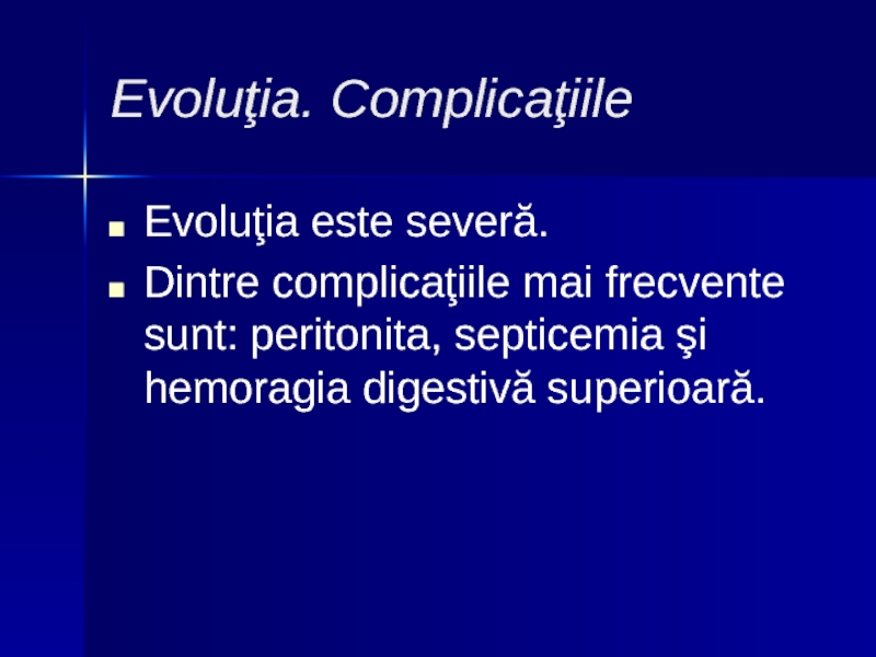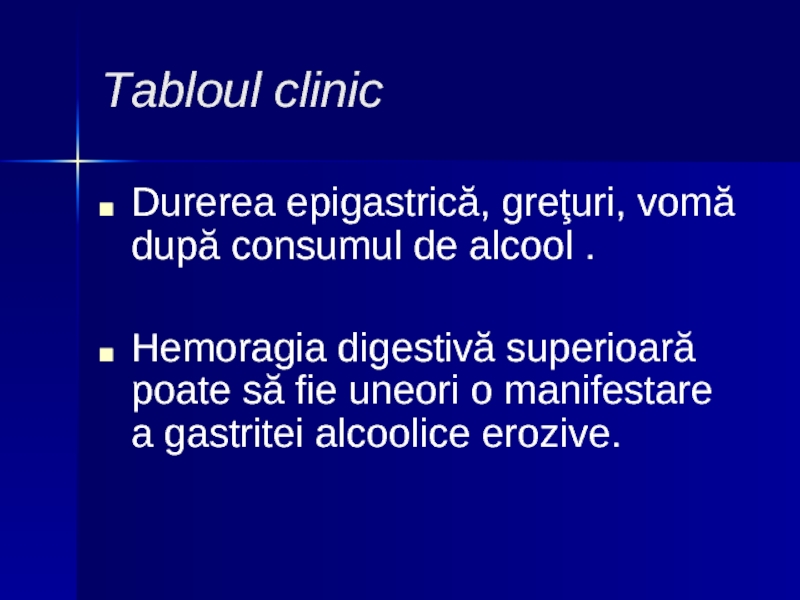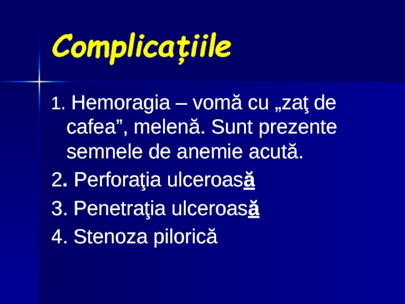 1. Hemoragia – vomă cu „zaţ de cafea”, melenă. Sunt