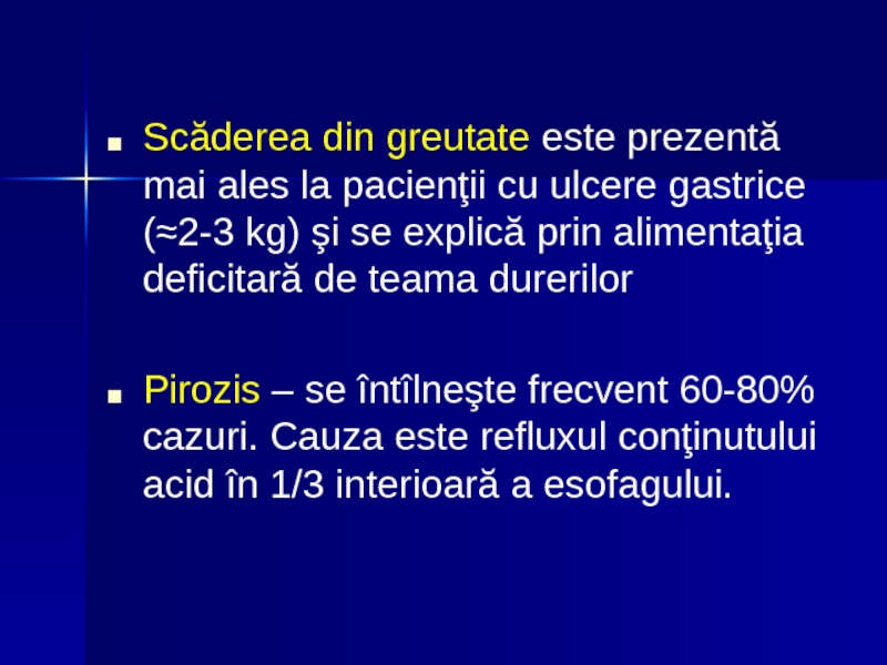gastrice (≈2-3 kg) şi se explică prin alimentaţia deficitară de teama durerilor