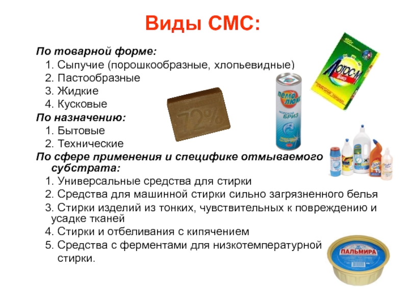 1916 году. Изобретение немецкого химика Фрица Понтера предназначалось только для промышленного использования. Бытовые СМС выпускаются с 1935 года, когда они стали менее вредными для кожи рук. С тех пор разработан целый ряд СМС узкого назначения, а их производство – это важнейшая отрасль химической промышленности.