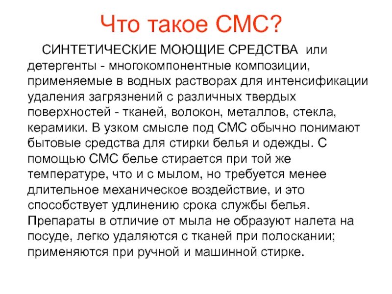 - многокомпонентные композиции, применяемые в водных растворах для интенсификации удаления загрязнений с различных твердых поверхностей - тканей, волокон, металлов, стекла, керамики. В узком смысле под СМС обычно понимают бытовые средства для стирки белья и одежды. С помощью СМС белье стирается при той же температуре, что и с мылом, но требуется менее длительное механическое воздействие, и это способствует удлинению срока службы белья. Препараты в отличие от мыла не образуют налета на посуде, легко удаляются с тканей при полоскании; применяются при ручной и машинной стирке.