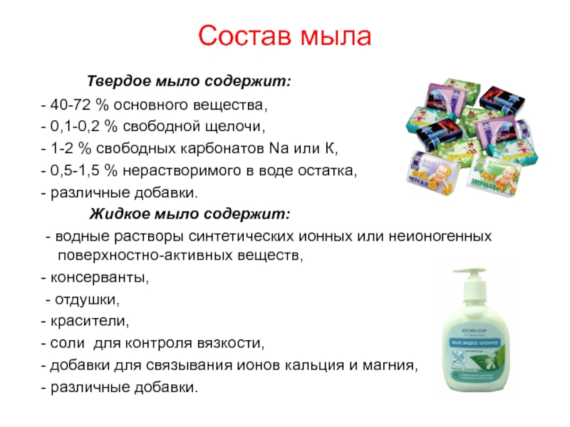 молекул, которые хорошо удаляют жир. Шампунь содержит специальные вещества, с помощью которых на волосах образуется пена. В средствах для мытья полов добавляют химические соединения хорошо отмывающие грязь, а в жидкие мыла для стирки –вещества, выводящие жирные пятна.