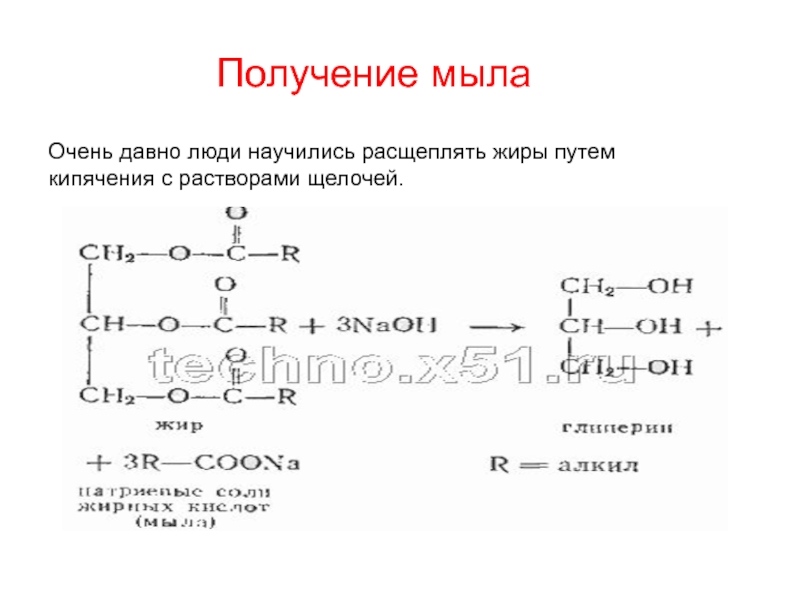 Слайд 20Очень давно люди научились расщеплять жиры путем кипячения с растворами щелочей.