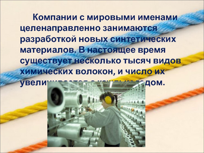 Слайд 14 Компании с мировыми именами целенаправленно занимаются разработкой новых синтетических материалов. В