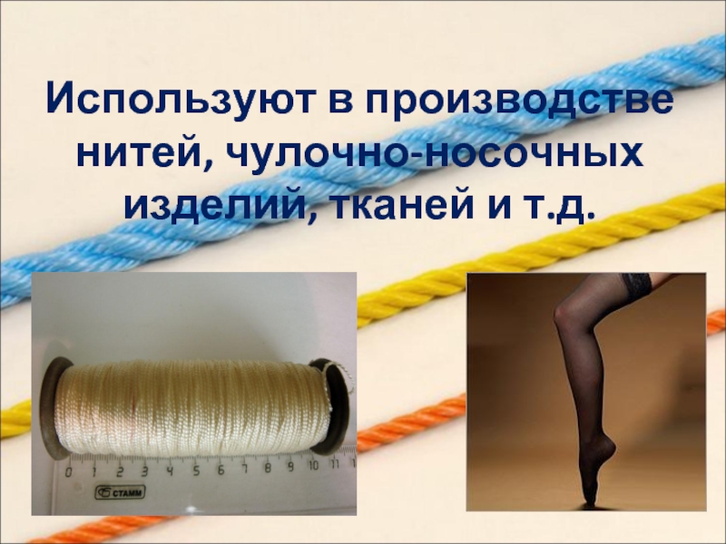 Слайд 7Используют в производстве нитей, чулочно-носочных изделий, тканей и т.д.