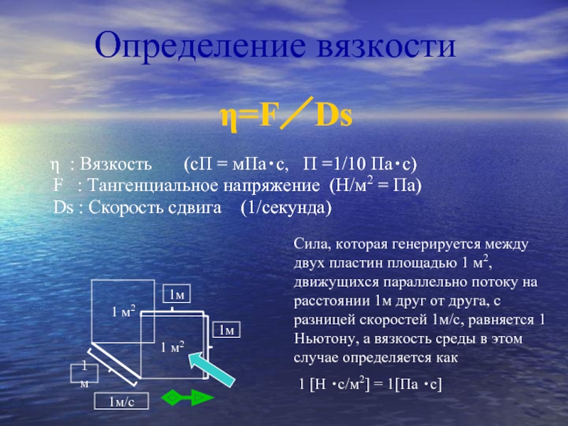 Сила, которая генерируется между двух пластин площадью 1 м2, движущихся параллельно потоку на расстоянии 1м друг от друга, с разницей скоростей 1м/с, равняется 1 Ньютону, а вязкость среды в этом случае определяется как