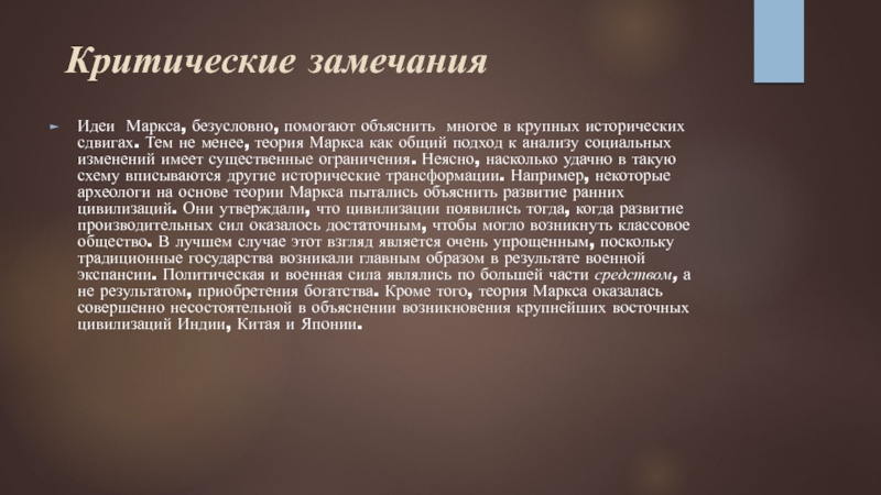 менее, теория Маркса как общий подход к анализу социальных изменений имеет существенные ограничения. Неясно, насколько удачно в такую схему вписываются другие исторические трансформации. Например, некоторые археологи на основе теории Маркса пытались объяснить развитие ранних цивилизаций. Они утверждали, что цивилизации появились тогда, когда развитие производительных сил оказалось достаточным, чтобы могло возникнуть классовое общество. В лучшем случае этот взгляд является очень упрощенным, поскольку традиционные государства возникали главным образом в результате военной экспансии. Политическая и военная сила являлись по большей части средством, а не результатом, приобретения богатства. Кроме того, теория Маркса оказалась совершенно несостоятельной в объяснении возникновения крупнейших восточных цивилизаций Индии, Китая и Японии.