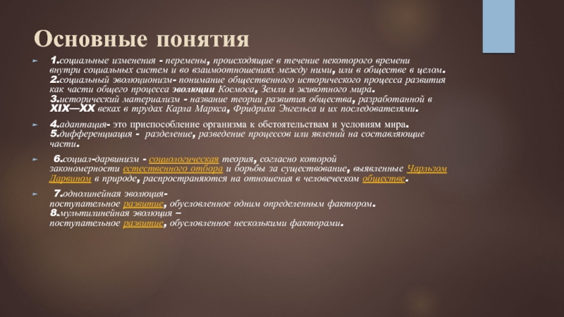 2.социальный эволюционизм- понимание общественного исторического процесса развития как части общего процесса эволюции Космоса, Земли и животного мира.