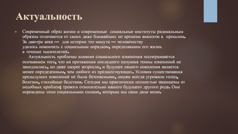 Актуальность проблемы влияния социального изменения подчеркивается осознанием того, что на протяжении последнего полувека темпы изменений не замедлились, но даже скорее возросли, и будущее нашего поколения является менее определенным, чем любого из предшествующих. Условия существования предыдущих поколений не были безопасными, людям всегда угрожали голод, болезни, стихийные бедствия. Сегодня мы практически полностью защищены от подобных проблем; тревоги относительно нашего будущего другого рода. Они порождены теми социальными силами, которым мы сами дали волю.