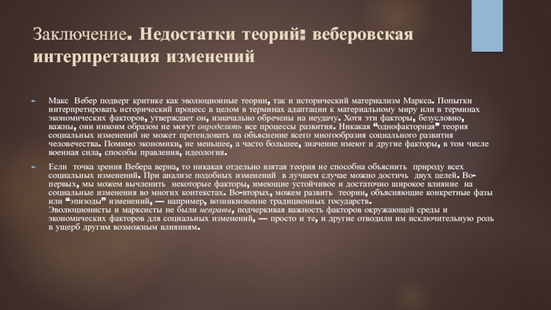 Слайд 12Заключение. Недостатки теорий: веберовская интерпретация изменений