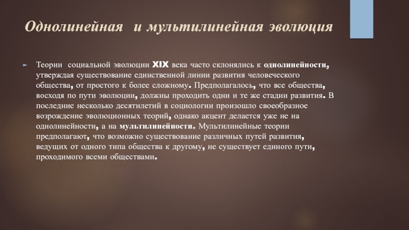 единственной линии развития человеческого общества, от простого к более сложному. Предполагалось, что все общества, восходя по пути эволюции, должны проходить одни и те же стадии развития. В последние несколько десятилетий в социологии произошло своеобразное возрождение эволюционных теорий, однако акцент делается уже не на однолинейности, а на мультилинейиости. Мультилинейные теории предполагают, что возможно существование различных путей развития, ведущих от одного типа общества к другому, не существует единого пути, проходимого всеми обществами.