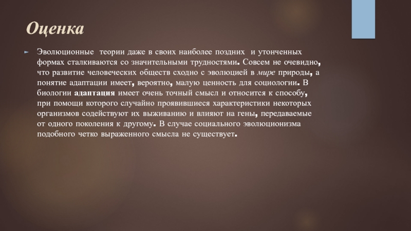 не очевидно, что развитие человеческих обществ сходно с эволюцией в мире природы, а понятие адаптации имеет, вероятно, малую ценность для социологии. В биологии адаптация имеет очень точный смысл и относится к способу, при помощи которого случайно проявившиеся характеристики некоторых организмов содействуют их выживанию и влияют на гены, передаваемые от одного поколения к другому. В случае социального эволюционизма подобного четко выраженного смысла не существует.