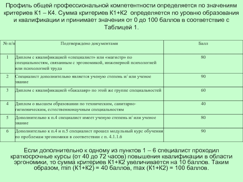 Если дополнительно к одному из пунктов 1 – 6 специалист проходил краткосрочные курсы (от 40 до 72 часов) повышения квалификации в области эргономики, то сумма критериев К1+К2 увеличивается на 10 баллов. Таким образом, min (К1+К2) = 40 баллов, max (К1+К2) = 100 баллов.