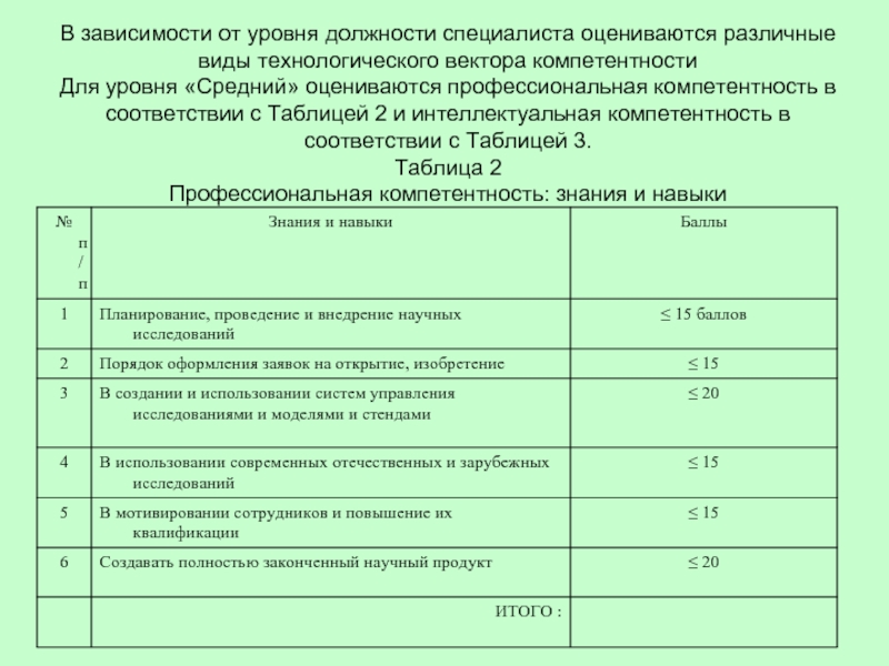 Для уровня «Средний» оцениваются профессиональная компетентность в соответствии с Таблицей 2 и интеллектуальная компетентность в соответствии с Таблицей 3.