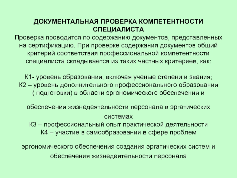 При проверке содержания документов общий критерий соответствия профессиональной компетентности специалиста складывается из таких частных критериев, как:
