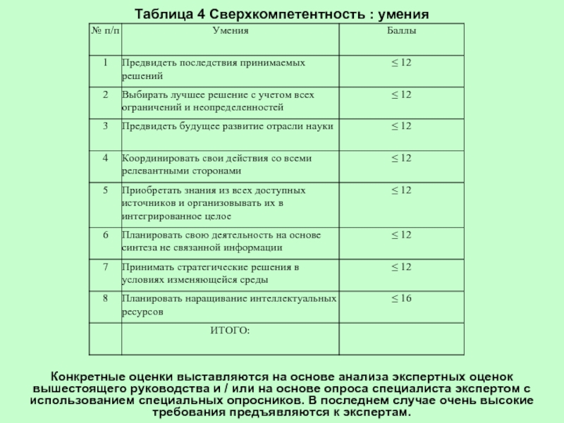 оценка сверхкомпетентности в соответствии с Таблицей 4.