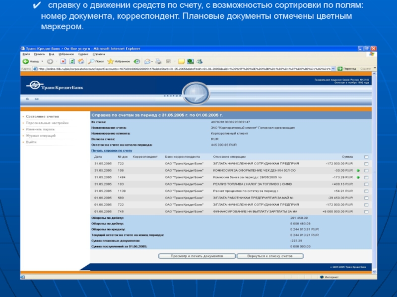 Слайд 10 справку о движении средств по счету, с возможностью сортировки