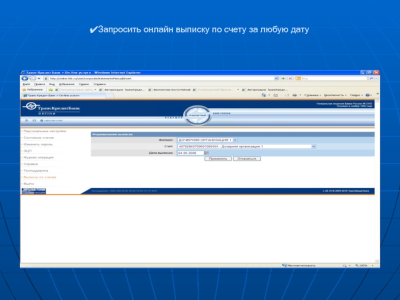 Слайд 12Запросить онлайн выписку по счету за любую дату