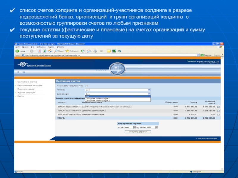 Слайд 9список счетов холдинга и организаций-участников холдинга в разрезе подразделений банка, организаций