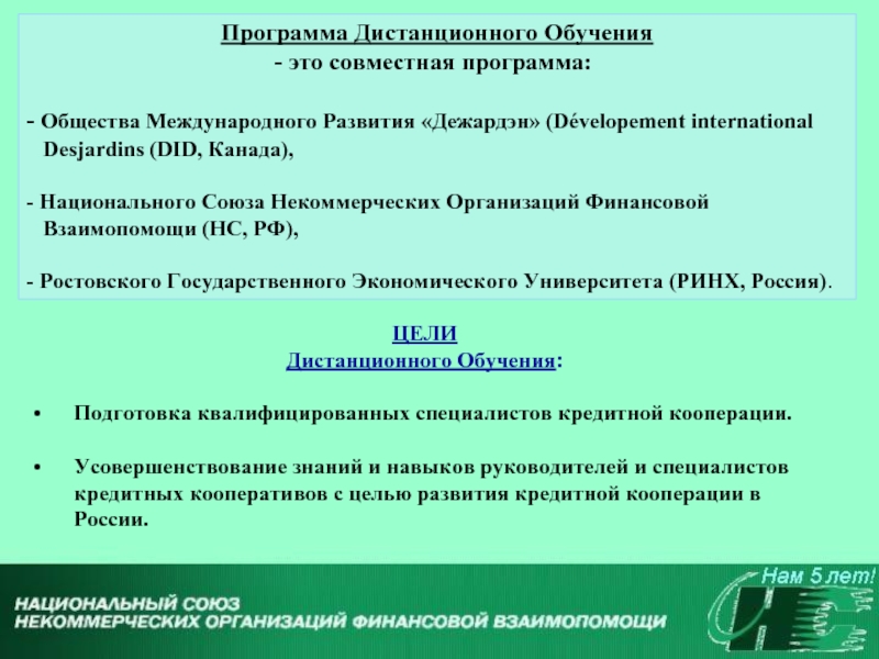 Усовершенствование знаний и навыков руководителей и специалистов кредитных кооперативов с целью развития кредитной кооперации в России.