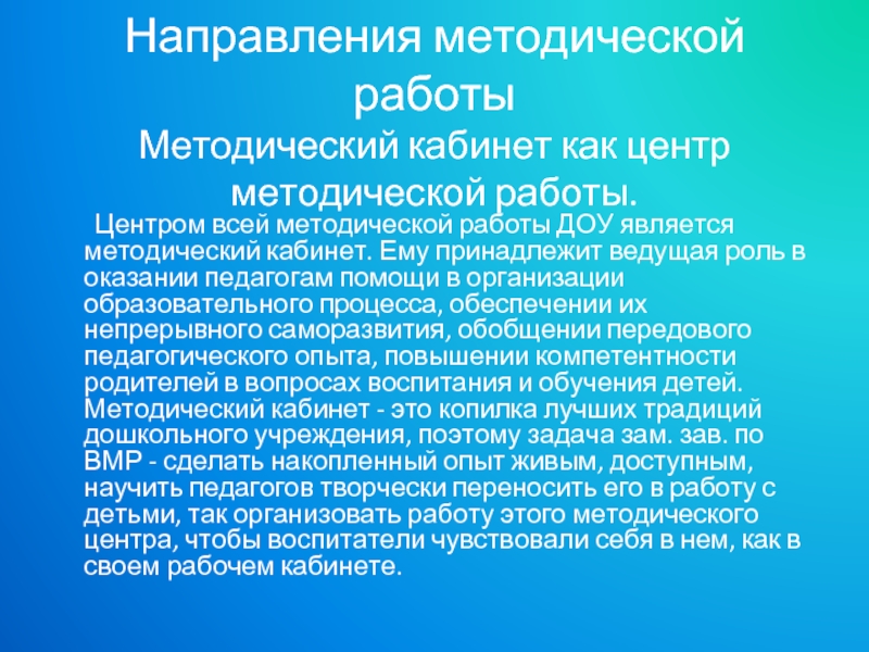 ДОУ является методический кабинет. Ему принадлежит ведущая роль в оказании педагогам помощи в организации образовательного процесса, обеспечении их непрерывного саморазвития, обобщении передового педагогического опыта, повышении компетентности родителей в вопросах воспитания и обучения детей. Методический кабинет - это копилка лучших традиций дошкольного учреждения, поэтому задача зам. зав. по ВМР - сделать накопленный опыт живым, доступным, научить педагогов творчески переносить его в работу с детьми, так организовать работу этого методического центра, чтобы воспитатели чувствовали себя в нем, как в своем рабочем кабинете.