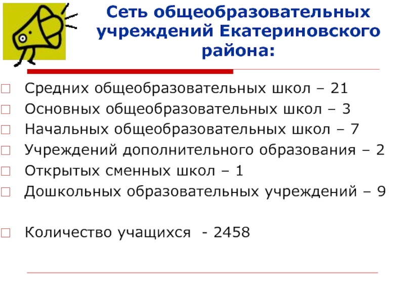 Слайд 2Сеть общеобразовательных учреждений Екатериновского района: