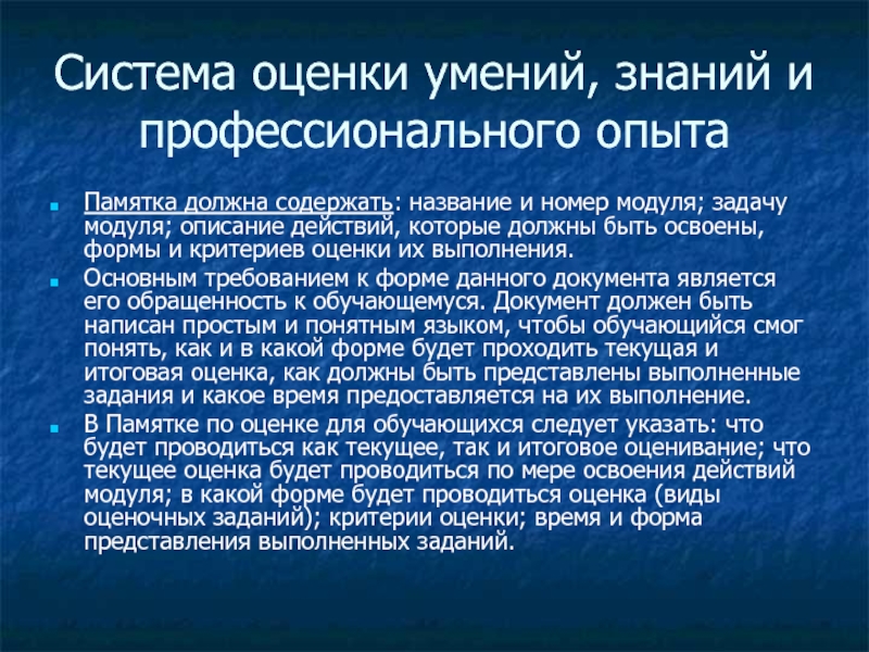 В этом документе указываются: название и номер модуля; общая характеристика процесса оценки, где указываются общие принципы и методы проведения оценки, тип свидетельств и требования к их документированию; рекомендации по проведению оценки, т.е., какие свидетельства должен собрать и документально зафиксировать преподаватель/экзаменатор для оценки выполнения обучающимся отдельных действий модуля (текущая оценка) и комплексных компетенций (итоговая оценка), методы оценки и критерии оценки.