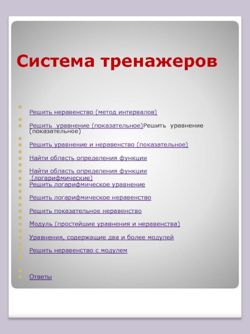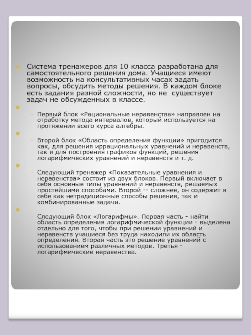 Система тренажеров для 10 класса разработана для самостоятельного решения дома. Учащиеся