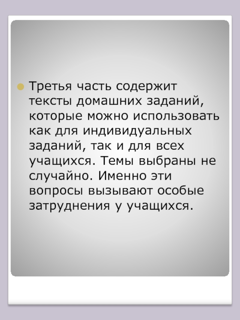 Третья часть содержит тексты домашних заданий, которые можно использовать как для