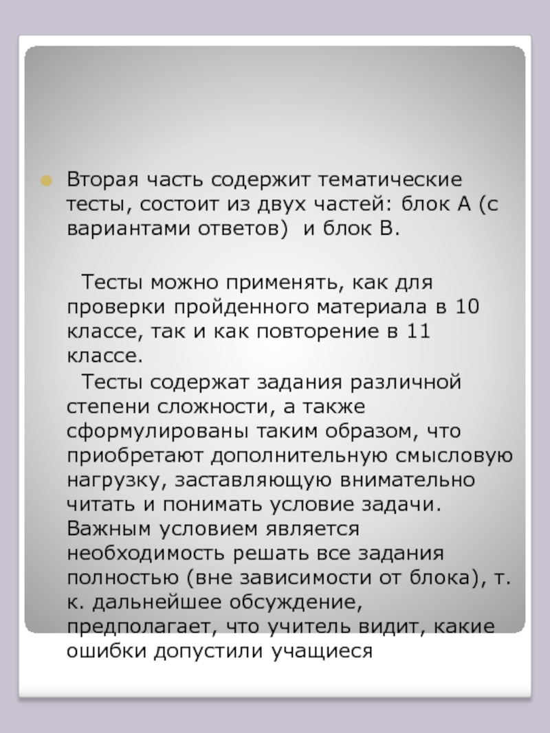 Тесты содержат задания различной степени сложности, а также сформулированы таким образом, что приобретают дополнительную смысловую нагрузку, заставляющую внимательно читать и понимать условие задачи. Важным условием является необходимость решать все задания полностью (вне зависимости от блока), т. к. дальнейшее обсуждение, предполагает, что учитель видит, какие ошибки допустили учащиеся
