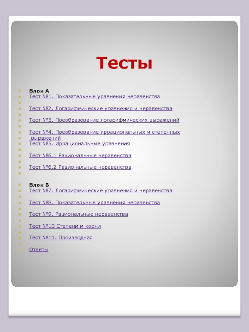 Следующий блок «Логарифмы». Первая часть - найти область определения логарифмической функции - выделена отдельно для того, чтобы при решении уравнений и неравенств учащиеся без труда находили их область определения. Вторая часть это решение уравнений с использованием различных методов. Третья - логарифмические неравенства.