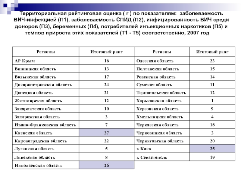 Слайд 18Территориальная рейтинговая оценка ( r ) по показателям: заболеваемость ВИЧ-инфекцией (П1),