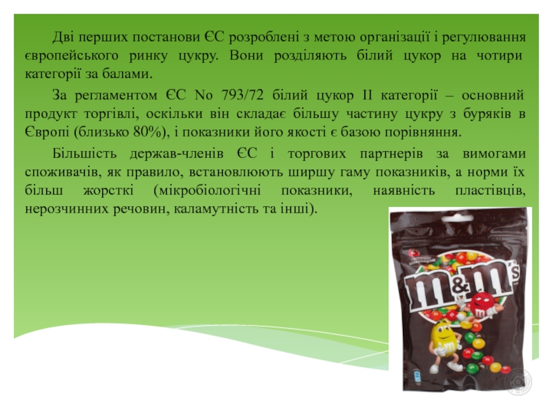 Законодавчі документи ЄС, що стосуються оцінки якості цукру і методів його контролю, такі: