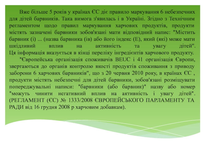 небезпечних для дітей барвників. Така вимога з'явилась і в Україні. Згідно з Технічним регламентом щодо правил маркування харчових продуктів, продукти містять зазначені барвники зобов'язані мати відповідний напис: "Містить барвник (і) ... (назва барвника (ів) або його індекс (Е), який (які) може мати шкідливий вплив на активність та увагу дітей".