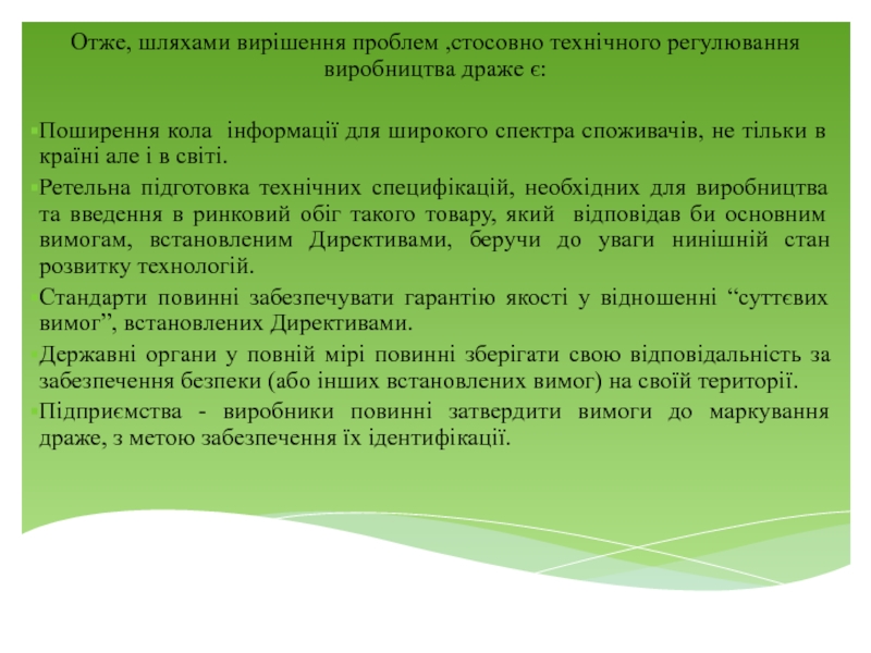 Слайд 8Отже, шляхами вирішення проблем ,стосовно технічного регулювання виробництва драже є: