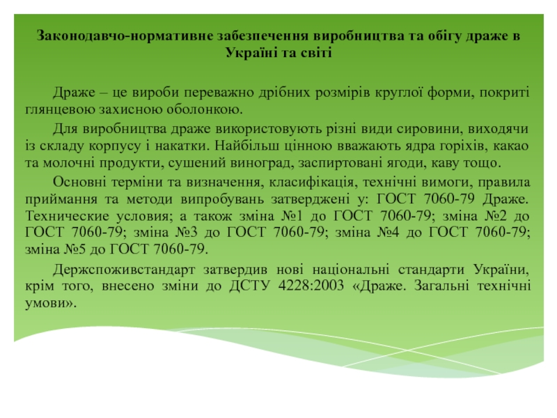 Слайд 2Законодавчо-нормативне забезпечення виробництва та обігу драже в Україні та світі