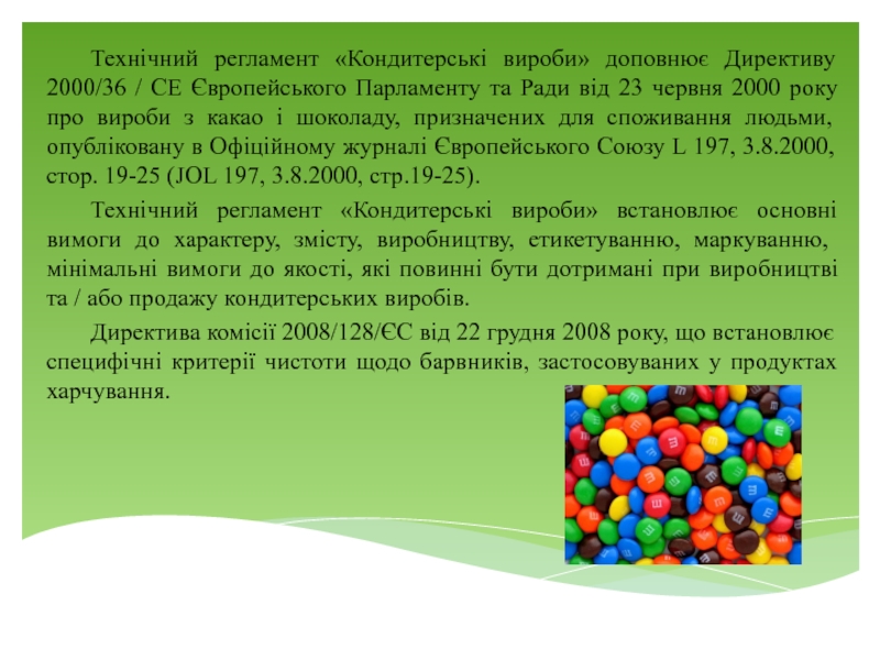 Слайд 4 Технічний регламент «Кондитерські вироби» доповнює Директиву 2000/36 / СЕ Європейського Парламенту