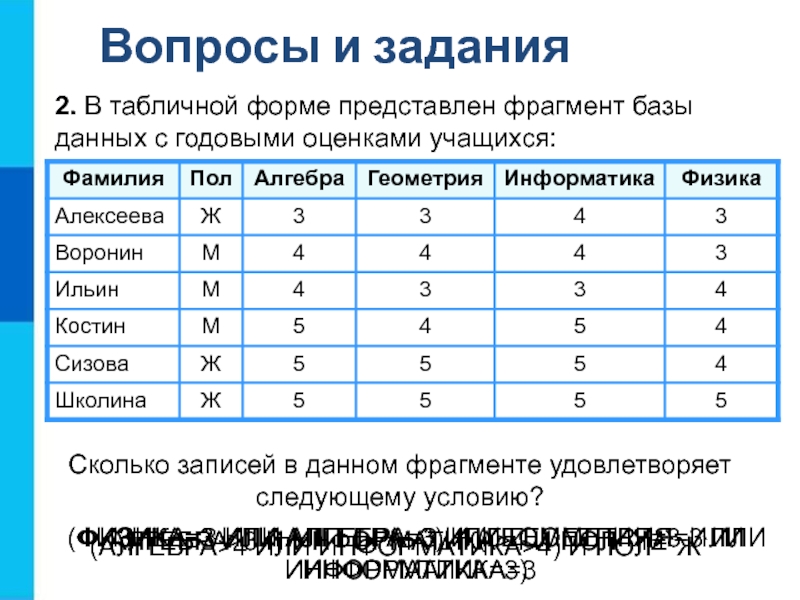 (АЛГЕБРА>4 ИЛИ ИНФОРМАТИКА>4) И ПОЛ=`Ж`