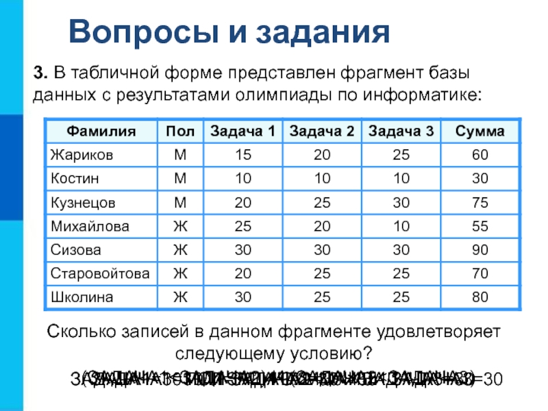 3. В табличной форме представлен фрагмент базы данных с результатами олимпиады по информатике: