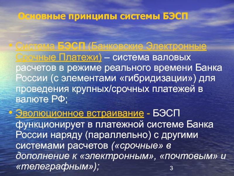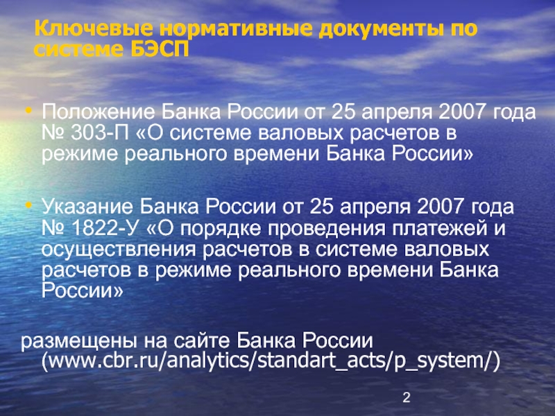 Слайд 1СИСТЕМА ВАЛОВЫХ РАСЧЕТОВ В РЕЖИМЕ РЕАЛЬНОГО ВРЕМЕНИ БАНКА РОССИИ (СИСТЕМА БЭСП)