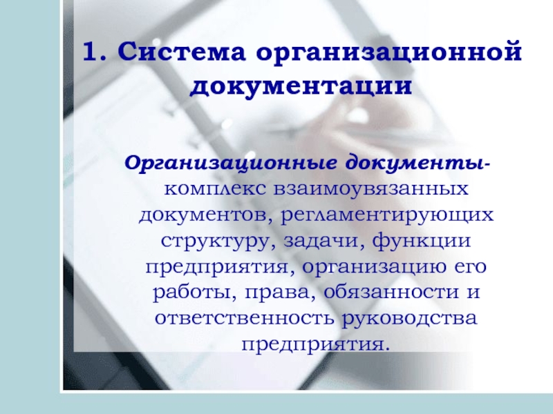 Организационные документы- комплекс взаимоувязанных документов, регламентирующих структуру, задачи,