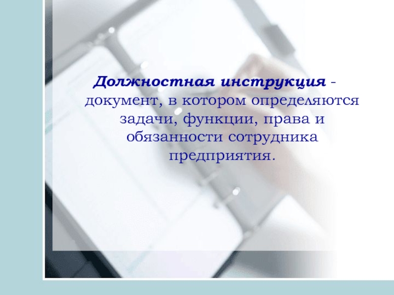Слайд 8Должностная инструкция - документ, в котором определяются задачи, функции, права и