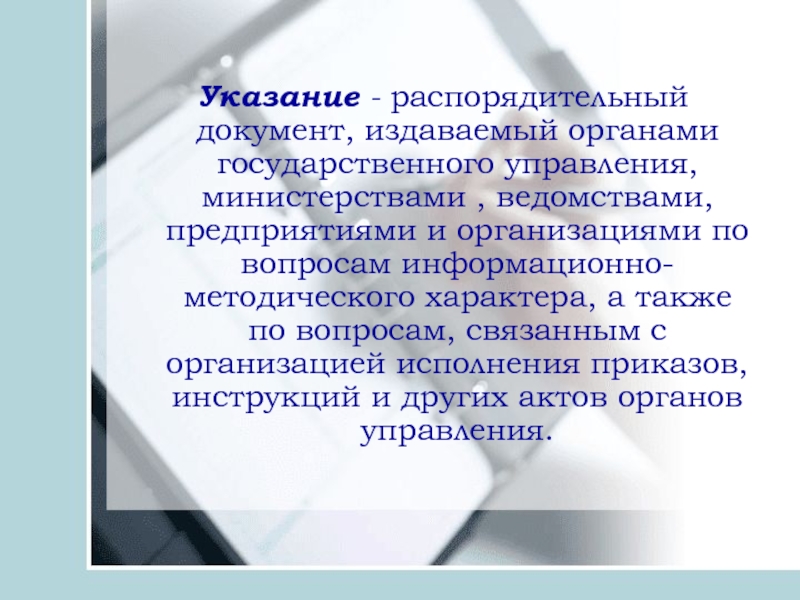 Слайд 16Указание - распорядительный документ, издаваемый органами государственного управления, министерствами , ведомствами,