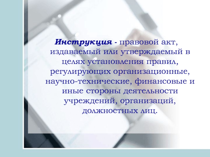 Слайд 7Инструкция - правовой акт, издаваемый или утверждаемый в целях установления правил,