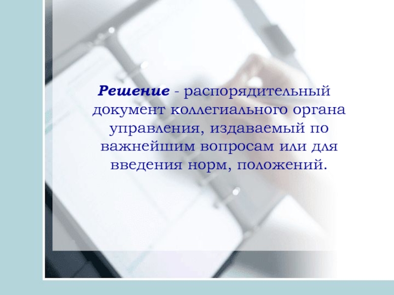 Слайд 17 Решение - распорядительный документ коллегиального органа управления, издаваемый по важнейшим