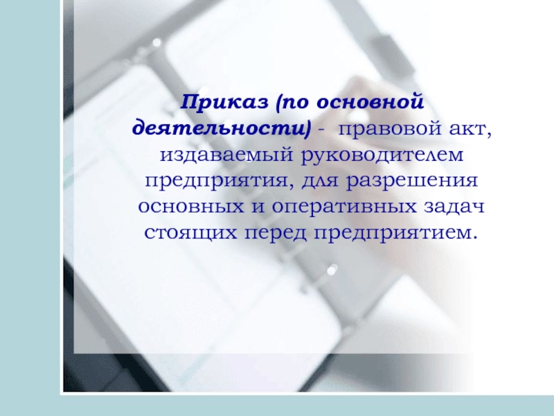 Слайд 14Приказ (по основной деятельности) - правовой акт, издаваемый руководителем предприятия, для