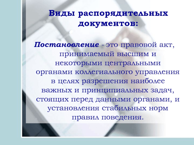 Постановление - это правовой акт, принимаемый высшим и некоторыми